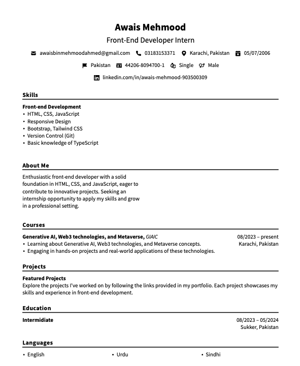 I am a passionate and dedicated Front-end developer with a strong foundation in modern web technologies. My journey in the tech world began with mastering HTML, CSS, and JavaScript, which laid the groundwork for my foray into more advanced frameworks and languages. This includes TypeScript and React, which have enabled me to build dynamic, responsive, and user-friendly web applications.